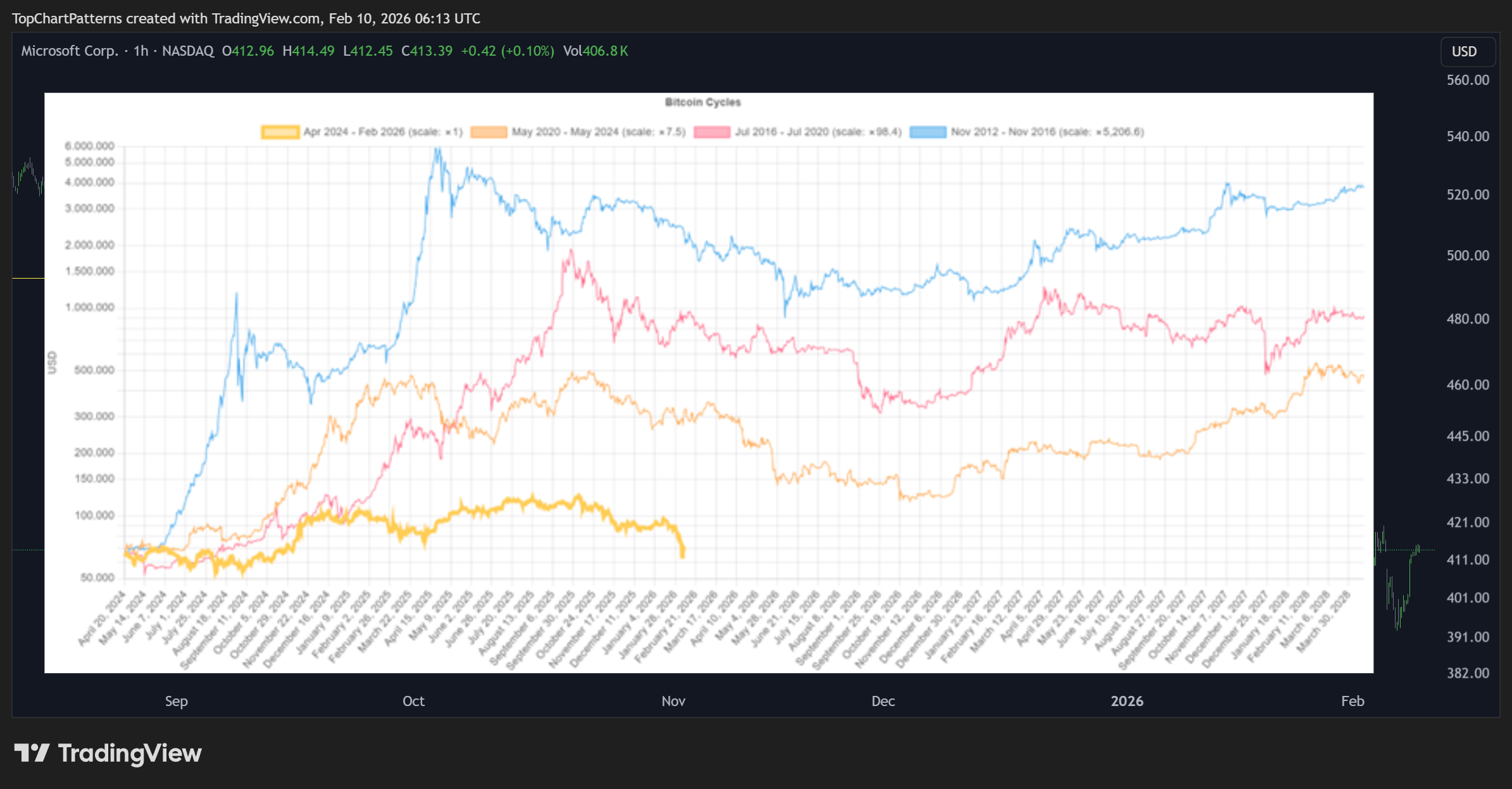 Cada linha é um ciclo desde seu Halving. Este evento acontece a cada 4 anos.