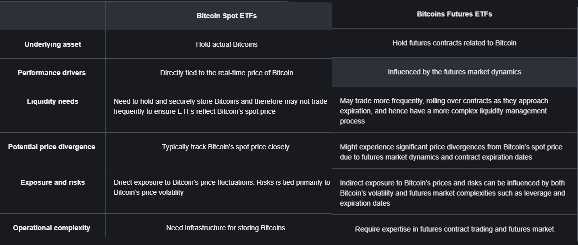 As principais diferenças entre ETFs de Bitcoin Spot e ETFs de Futuros de Bitcoin podem ser resumidas na tabela abaixo. Observe que essas diferenças são semelhantes se os ativos subjacentes forem Ether ou outros ativos.