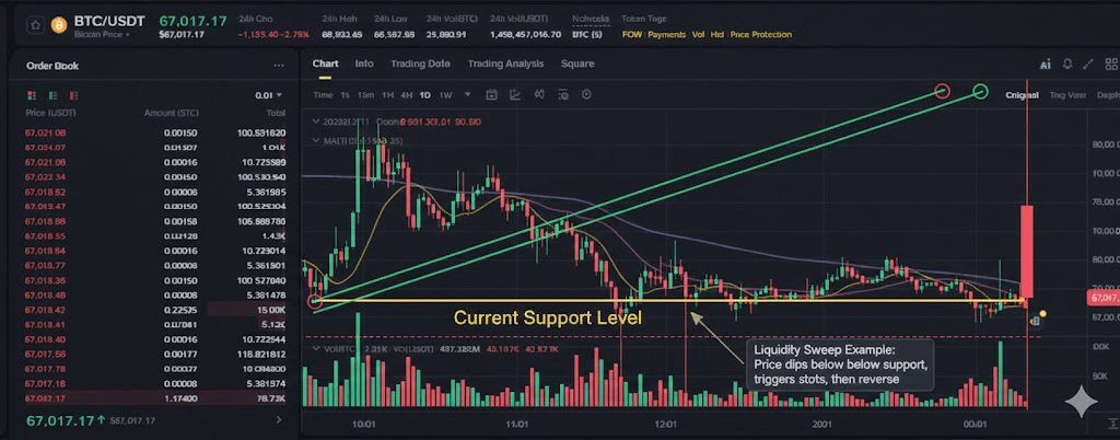 Então, quando o preço cai para um nível como $67K, especialmente se ele quebra ligeiramente abaixo, esse movimento pode simplesmente ser uma captura de liquidez.