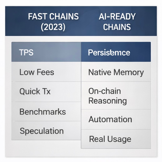 Ainda classificamos as cadeias por TPS, taxas e latência. Sistemas de IA se preocupam com persistência, confiabilidade, auditabilidade e continuidade. É uma era diferente com um placar diferente. Em 2026, as plataformas dominantes não serão as mais rápidas, mas aquelas onde sistemas inteligentes não esquecem o dia anterior.
