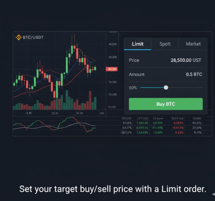 Uma ordem limite permite que você compre ou venda um ativo crypto a um preço específico ou melhor. Ao contrário de uma ordem de mercado que é executada imediatamente ao preço atual, uma ordem limite só é executada se o mercado atingir seu preço-alvo.