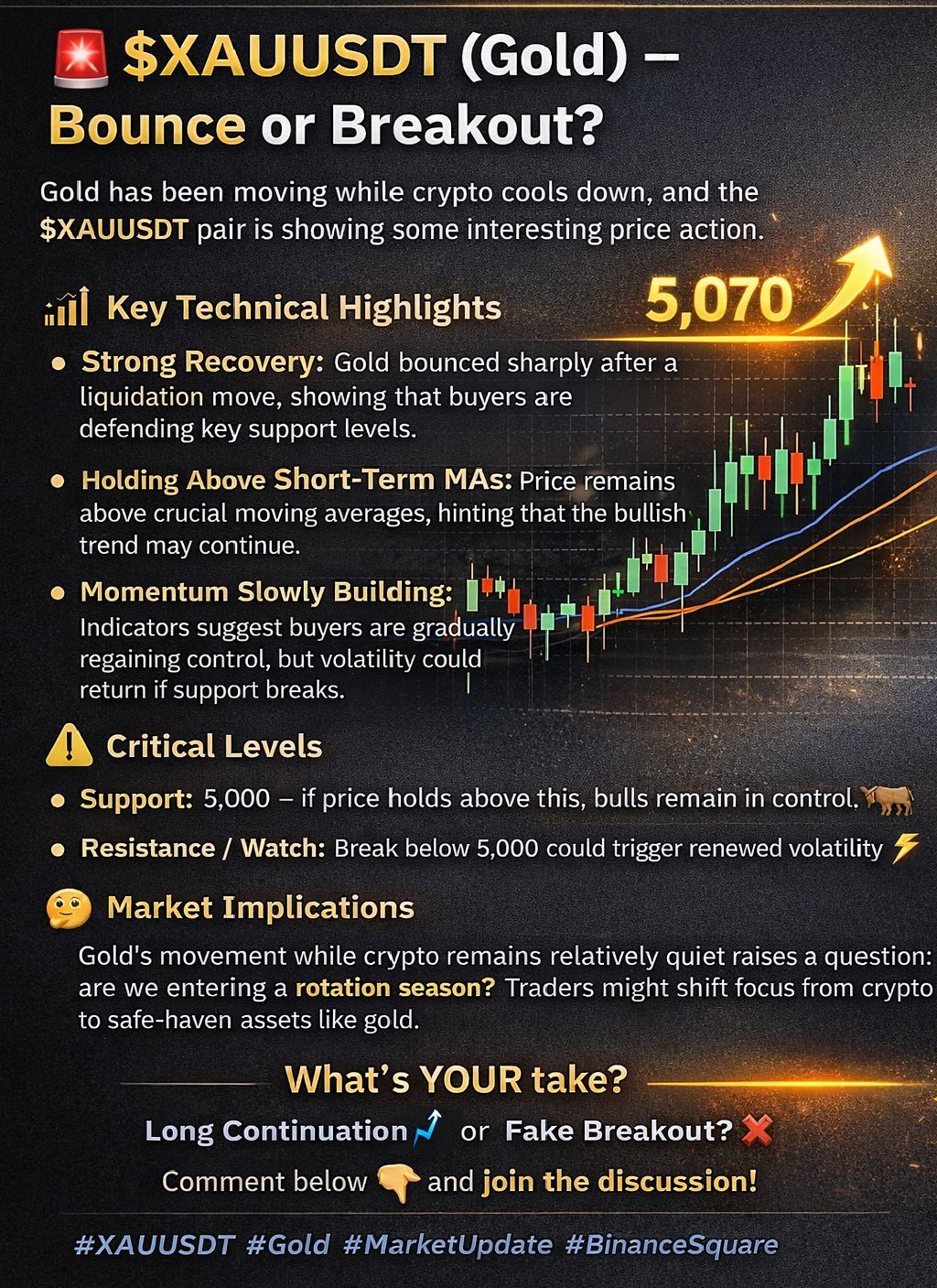 O ouro tem se movimentado enquanto o cripto esfria, e o par $XAU USDT está mostrando algumas ações de preço interessantes. Após uma recente sacudida, os compradores entraram e empurraram o preço de volta acima de 5,070, sinalizando uma possível recuperação de alta.