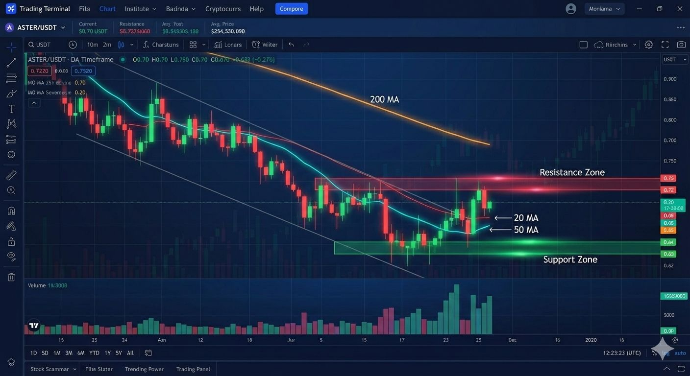 On the daily timeframe, the ASTER/USDT chart shows a market transitioning from a clear downtrend (lower highs, lower lows) into a potential short-term recovery, but the higher-timeframe structure still dominates, reminding us that big picture beats noise; price recently bounced from a strong support zone around $0.63–$0.65, confirmed by long lower candlestick wicks that signal aggressive buyer rejection at lows, while the current price near $0.70 is approaching a minor resistance ceiling around $0.72–$0.75, where sellers previously stepped in ( #SupportResistance ). Volume expanded on the bounce, which adds validity to the move and reduces the chance of a fake-out, yet volume is still not explosive enough to confirm a full trend reversal (#volumeprofile ). The moving averages tell an important story: price is reclaiming short MAs (20/50), suggesting improving momentum, but it remains well below the long MA (200), keeping the macro bias cautious (#MovingAverages ). From a confluence perspective, we have (1) support reaction, (2) improving volume, and (3) momentum shift, but without a confirmed higher high on the daily, this remains a probability play, not certainty, aligning with the 70/30 rule that markets range more than they trend #CONFLUENCE ). Practical verdict: for the short term, a speculative buy is reasonable with targets near $0.75–$0.80 if volume holds and momentum continues; for the long term, this is still a wait or cautious accumulation zone, not an aggressive buy, until ASTER reclaims and holds above the 200 MA with a confirmed higher-high structure—risk management and a clear stop below support are non-negotiable (#RiskManagement ).