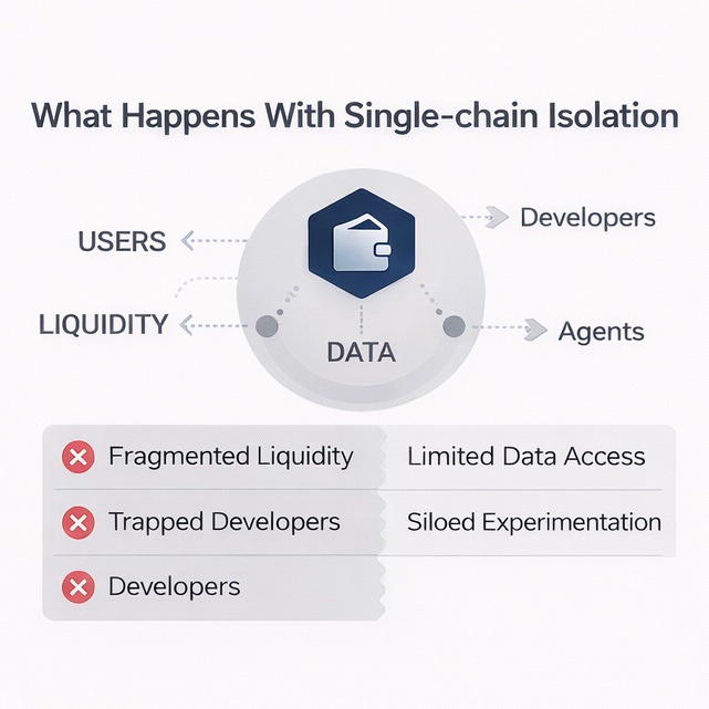 A isolação não apenas retarda a adoção. Ela sufoca a experimentação. Os agentes não conseguem acessar dados mais amplos, a liquidez permanece fragmentada, e os desenvolvedores acabam construindo dentro de bolhas pequenas e desconectadas. Uma grande tecnologia acumula poeira porque sair dessa bolha parece ser atrito, não oportunidade.