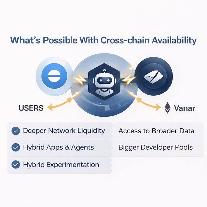 A IA torna esse problema de isolamento ainda mais brutal. Os agentes não são ilhas; eles dependem de dados interconectados e ações coordenadas. Um sistema que raciocina sobre ativos tokenizados pode precisar consultar liquidez na Base, verificar conformidade no Vanar e executar liquidação no Ethereum — tudo sem expor a complexidade ao usuário. Sem disponibilidade cross-chain, a IA fica presa em demonstrações. Com isso, os agentes se tornam ferramentas utilizáveis para comércio, jogos, análises e personalização.