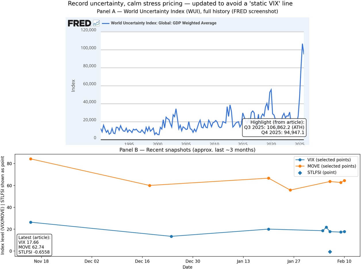 The World Uncertainty Index (WUI) a GDP weighted measure built from how often “uncertainty” appears in country reports hit 106,862.2 in Q3 2025 and stayed elevated at 94,947.1 in Q4.