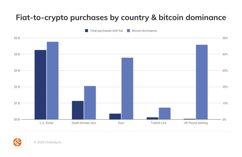 Abaixo está o Índice de Adoção Global de Criptomoedas da Chainalysis 2025: Fiat on-ramp e dominância do Bitcoin