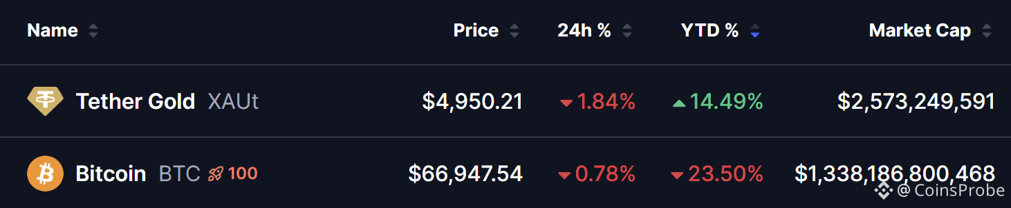 At the same time, Tether Gold (XAUT) — the tokenized version backed 1:1 by physical gold — is tracking closely near $4,950, down about 1.84% on the day but still up over 14% year-to-date. Meanwhile, Bitcoin continues to lag around the mid-$60K region, highlighting gold’s relative strength so far in 2026.