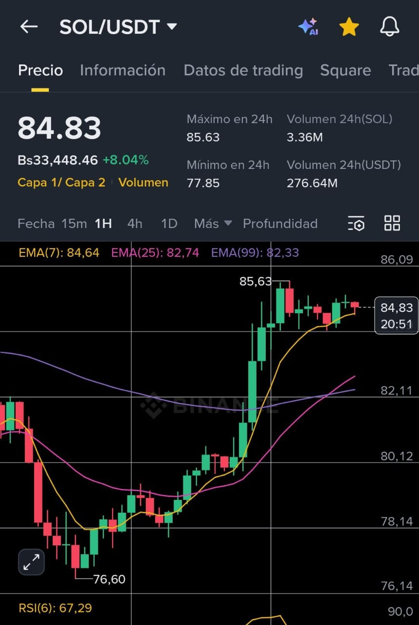 Consolidação em Máximos: O preço subiu de R$84,30 para R$85,00. Atualmente, SOL está "martelando" a resistência de R$85,63 (seu máximo de 24h).