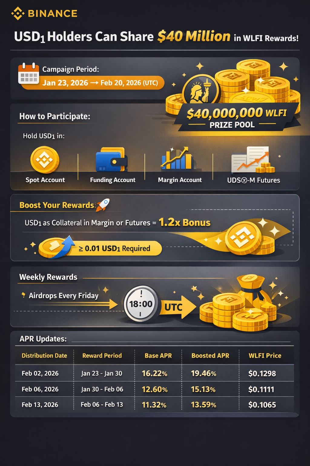 A campanha de airdrop de $40 M WLFI da Binance está ativamente em andamento (23 de janeiro ➝ 20 de fevereiro de 2026), recompensando os detentores da stablecoin USD1 com distribuições semanais de WLFI. �