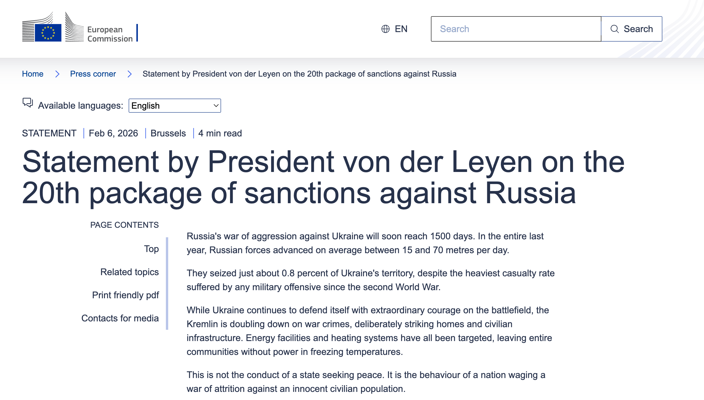 On February 6, Commission President von der Leyen unveiled the 20th sanctions package against Russia. The crypto piece is the sharpest yet: instead of listing individual platforms, a strategy that just spawned replacements like Grinex and the A7 network, Brussels wants to prohibit EU entities from engaging with any crypto service provider established in Russia. The digital ruble is also targeted, as is the A7A5 stablecoin, which processed $100 billion in cumulative volume despite being sanctioned by both the U.S. and EU last year.