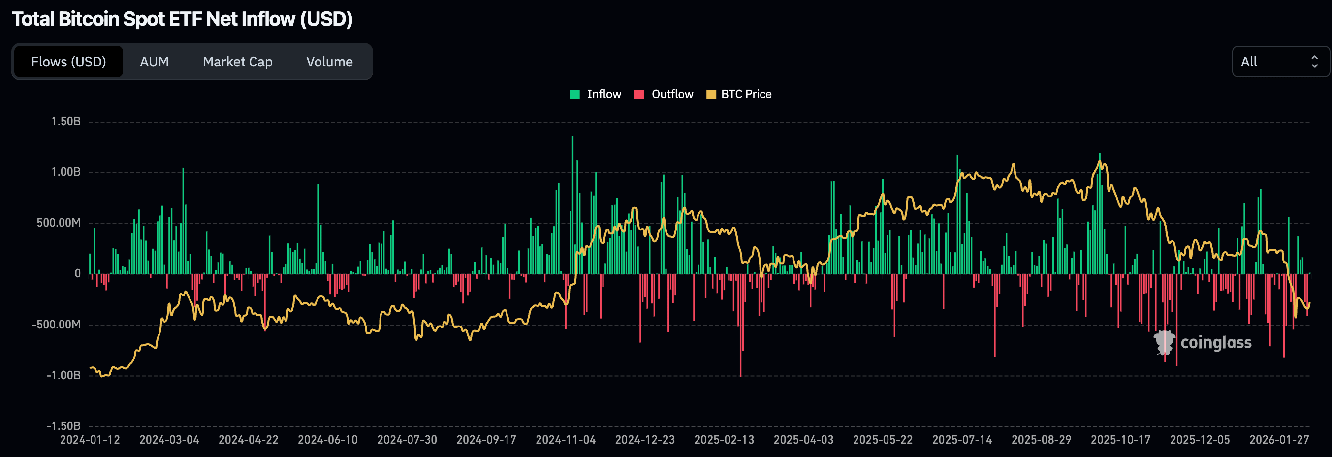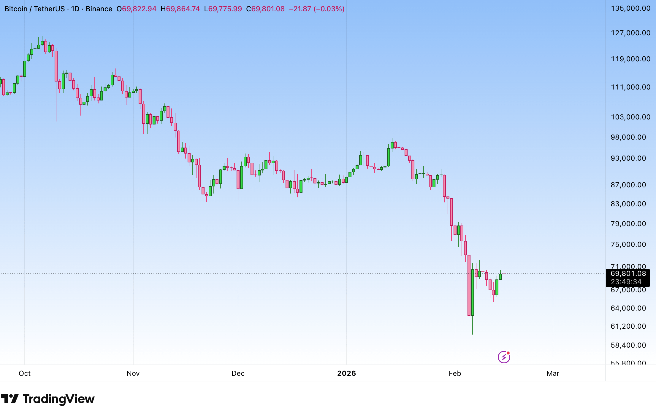 The ETF picture adds context. Spot BTC ETFs have posted four straight weeks of net outflows, with roughly $360 million leaving in the week ending February 14. BTC is trading around $67,000, down 25% year-to-date and nearly 50% from its October high. Yet total BTC held in ETFs has only dipped about 7%, suggesting core holders remain. The market is stressed but not structurally broken.