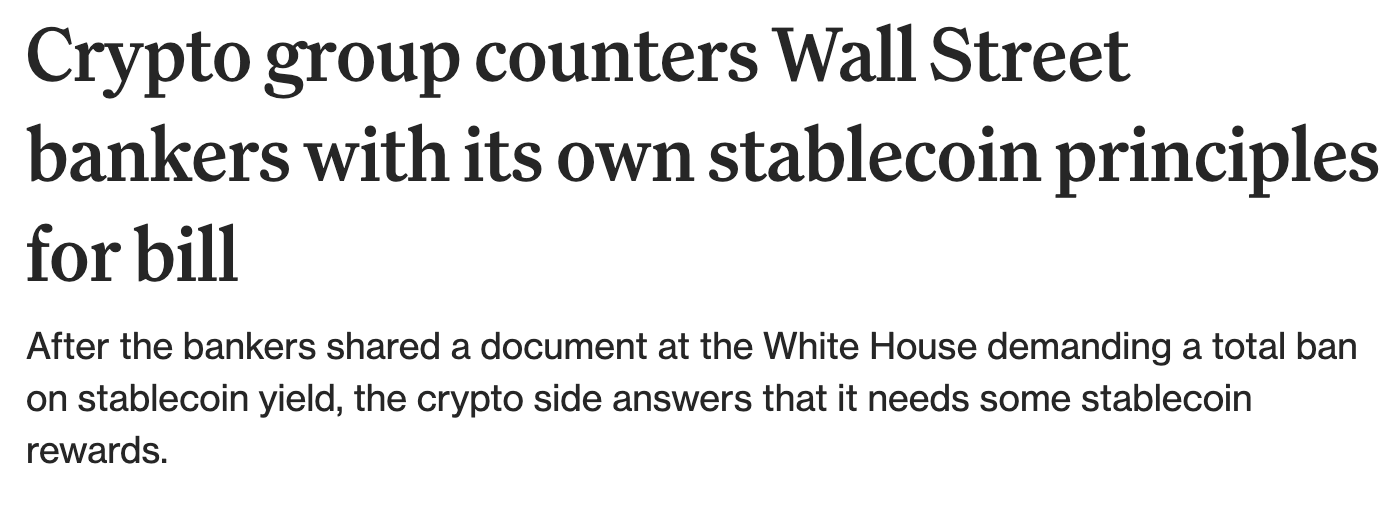The core dispute is stablecoin yield. Banks, led by JPMorgan, Goldman, and Citi, circulated a one-page document demanding a total ban on any rewards or incentives for stablecoin holders. Their argument: yield-bearing stablecoins could drain trillions from bank deposits. The crypto side, represented by the Digital Chamber, Coinbase, and Ripple, countered on February 13 with a compromise, concede on passive idle yield but preserve rewards tied to liquidity provision and ecosystem participation.