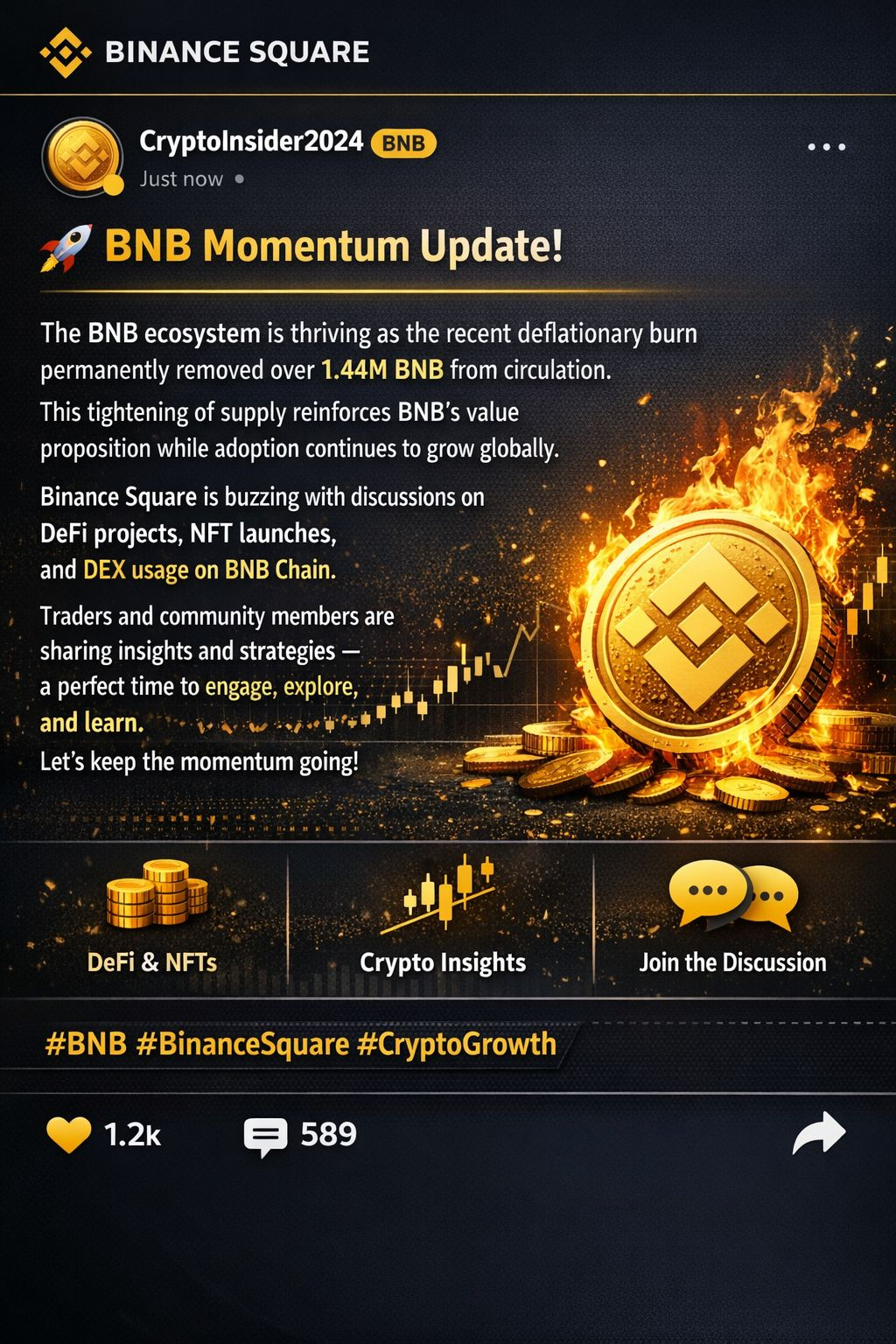 The BNB ecosystem is thriving as the recent deflationary burn permanently removed over 1.44M BNB from circulation. This tightening of supply reinforces BNB’s value proposition while adoption continues to grow globally. Binance Square is buzzing with discussions on DeFi projects, NFT launches, and DEX usage on BNB Chain. Traders and community members are sharing insights and strategies — a perfect time to engage, explore, and learn. Let’s keep the momentum going! #BNB #BinanceSquare #CryptoGrowth