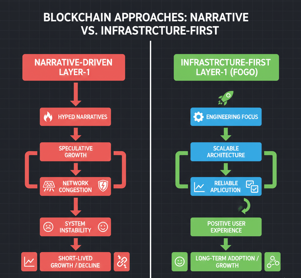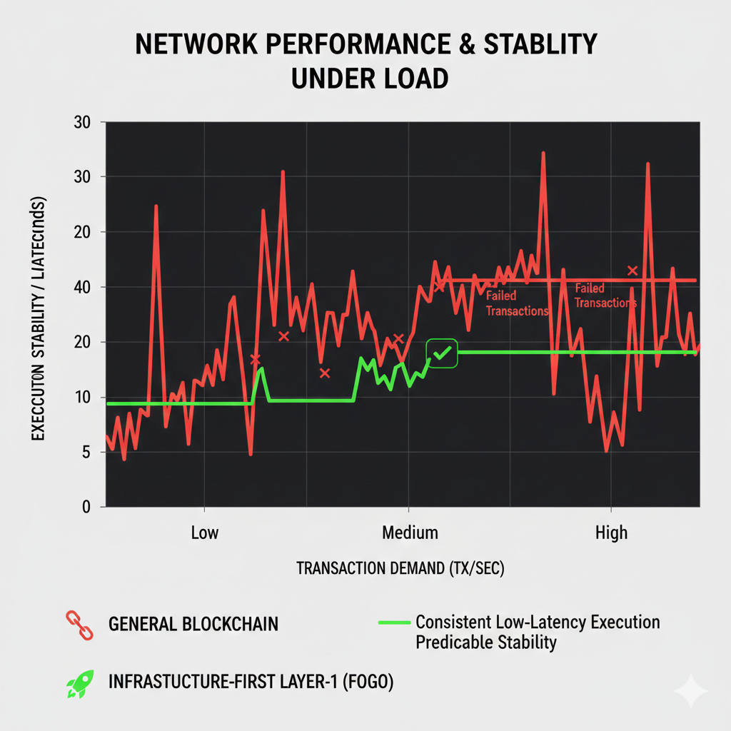 Muitas redes crescem rapidamente por meio de narrativas fortes, mas falham em manter o desempenho uma vez que usuários reais chegam. O design com foco em infraestrutura evita essa armadilha ao priorizar a confiabilidade desde o início. A abordagem da Fogo foca em construir sistemas que continuam a funcionar suavemente em condições reais, em vez de otimizar para cenários ideais.