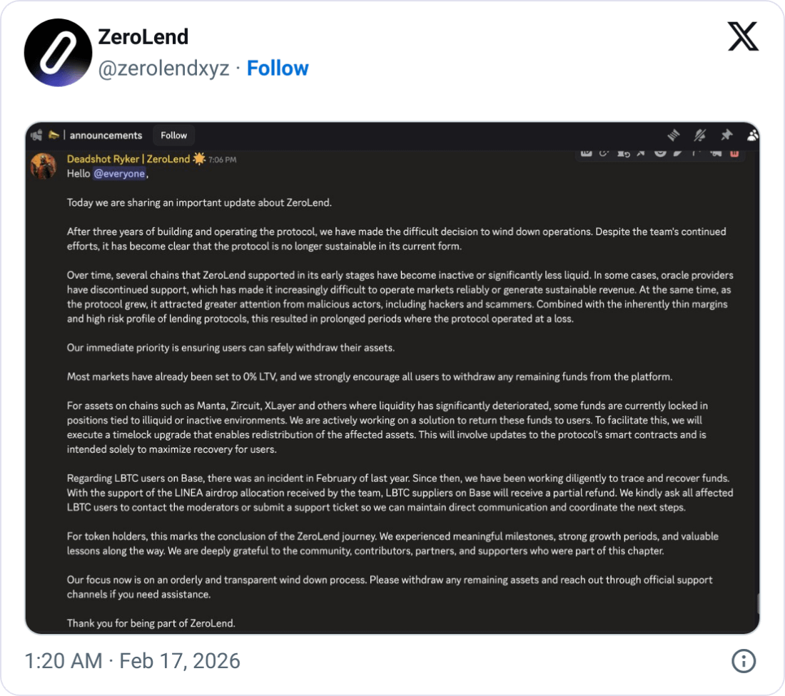 Ryker da ZeroLend disse que a razão para o fechamento é que várias blockchains que o protocolo suportava “se tornaram inativas ou significativamente menos líquidas.”