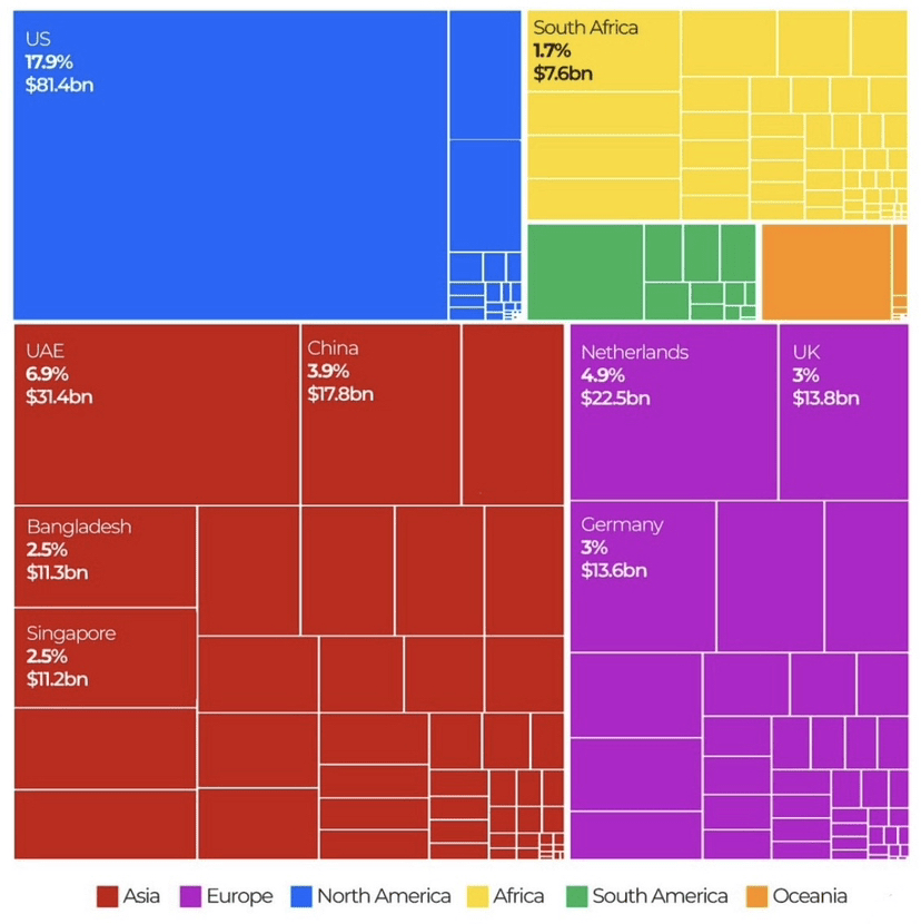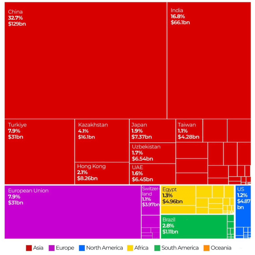 Antes da guerra na Ucrânia, as exportações da Rússia eram mais diversificadas. Em 2023, após sanções ocidentais, seu comércio se deslocou para o leste, focando na China, Índia e Turquia.