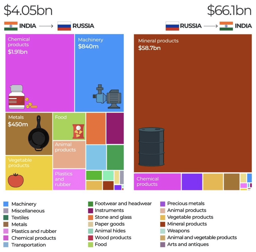 A Índia possui um grande déficit comercial com a Rússia, importando muito mais do que exporta, com produtos de energia representando quase 88 por cento de suas importações em 2023.
