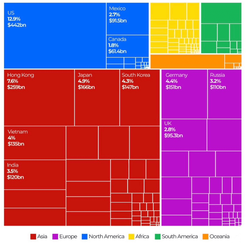 A China tem uma gama diversificada de parceiros comerciais. O maior deles é os EUA, para onde exportou $442 bilhões, ou 12,9 por cento de suas exportações totais.