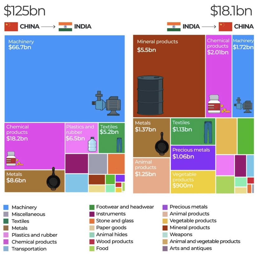 Em 2023, a China exportou $125 bilhões em bens para a Índia, enquanto a Índia exportou $18,1 bilhões para a China.