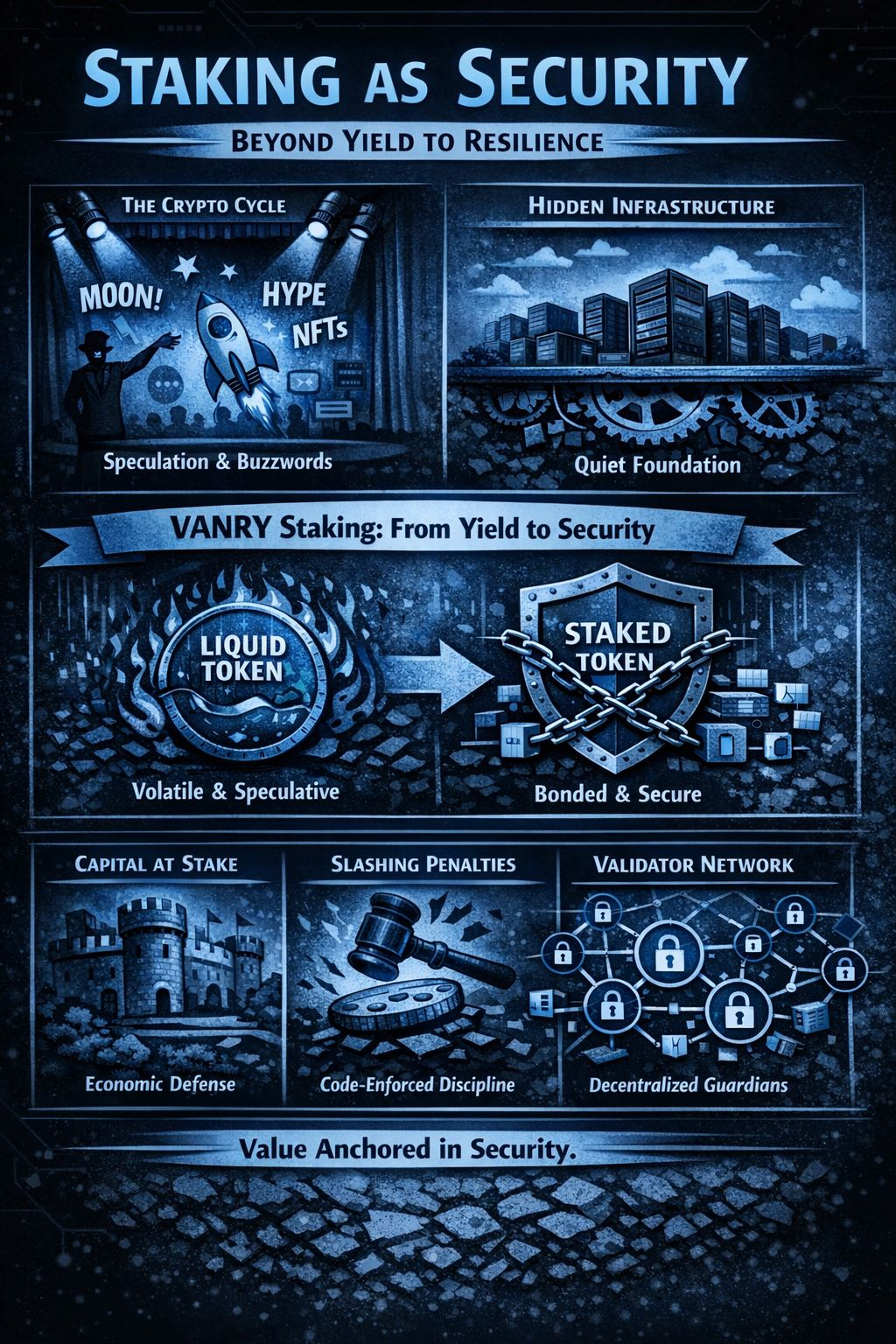 VANRY’s staking model is not spectacular by design. It is disciplined. It embeds security into the token economy itself, ensuring that the network’s defenders are economically inseparable from its success.