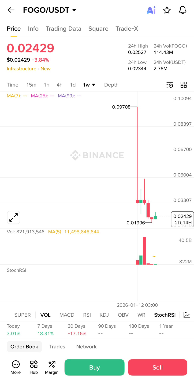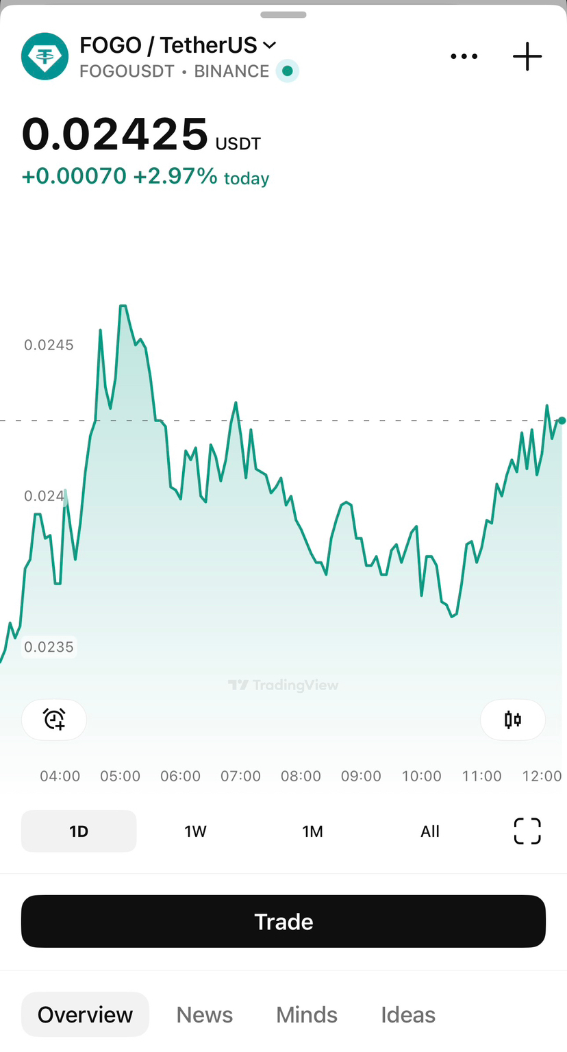 A partir do gráfico, estamos vendo o FOGO sendo negociado na área de $0.0242 – $0.02425. De um lado, está mostrando cerca de -3.9% em 24H, mas quando você olha mais profundamente no gráfico intradia, também está mostrando +2.97% hoje no par Binance FOGO/USDT. Isso é o que confunde muitos traders. Um aplicativo mostrando vermelho, outro intervalo de tempo mostrando verde. Mas isso é normal no mercado de criptomoedas, nada novo.