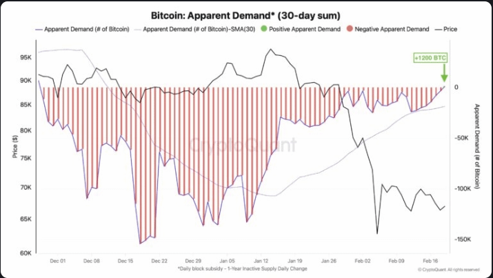 Um desenvolvimento construtivo em meio ao cenário de baixa é uma mudança positiva na demanda cumulativa mensal de Bitcoin. Após aproximadamente três meses consecutivos de atividade de compra contida, essa métrica virou para cima, sugerindo que a acumulação estrutural está começando a absorver a nova oferta que entra no mercado.