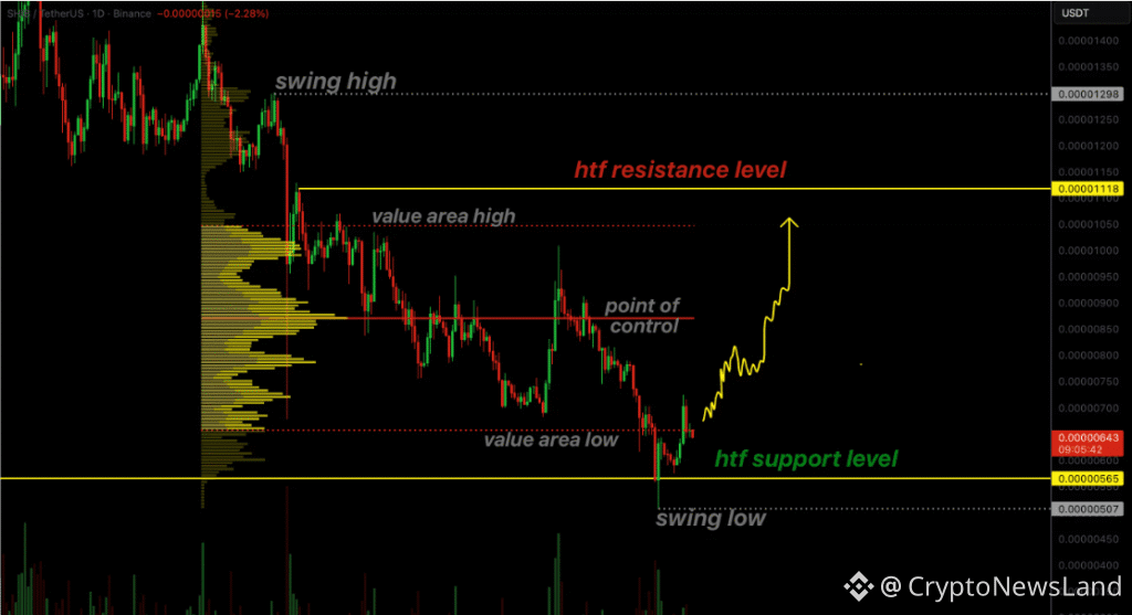 Following the reclaim of support, Shiba Inu has entered a phase of consolidation around the value area low of its prior trading range. This region is crucial because it represents the lower boundary of fair value, often acting as a pause point in the market. Holding above this level indicates that buyers are absorbing supply at lower levels, strengthening the case for further upside. A failure to maintain this support could prompt renewed downside risk, but for now, the price action remains balanced.