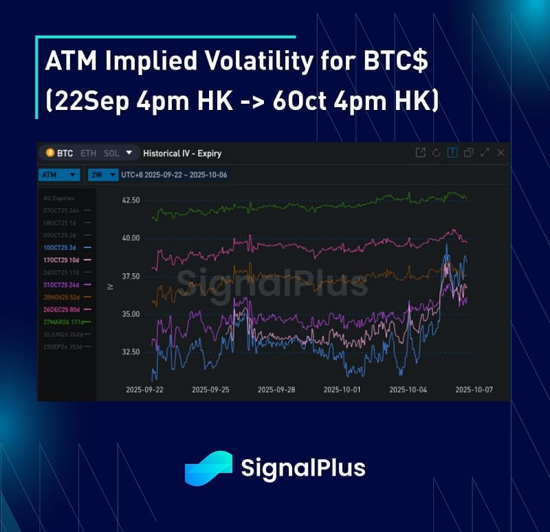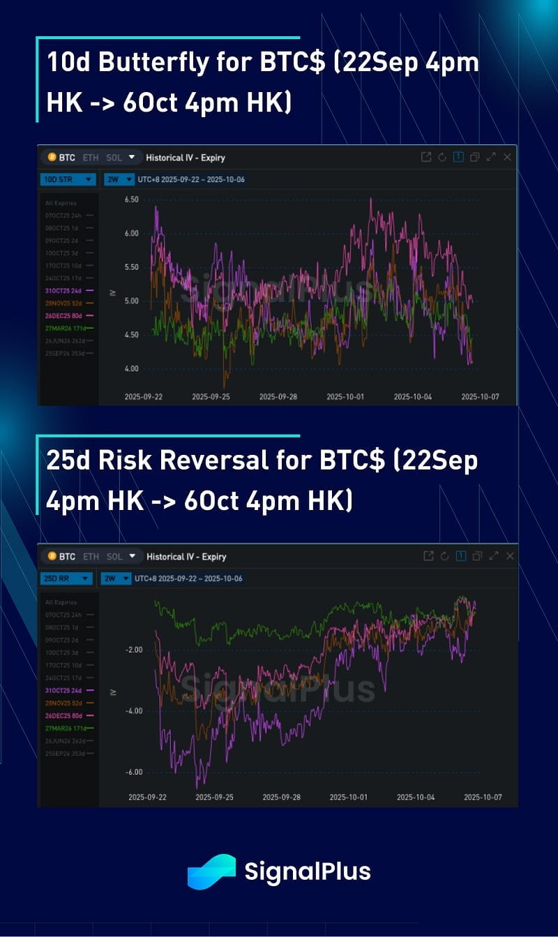 O vol realizado sem brilho compensou o prêmio de risco usual que esperaríamos ver em uma quebra de preço/range mais alta, resultando em uma curva de vol implícita amplamente estática para expirações de 1 mês em diante. Os implícitos de curto prazo subiram significativamente, dadas as movimentações inesperadas durante o fim de semana, embora o preço tenha encontrado um nível por enquanto em torno de $123–124k e o vol realizado ainda permaneça contido, poderíamos esperar uma correção para baixo nessas expirações rapidamente. Com o fechamento do governo dos EUA, a variância para os dados NFP e CPI permanece 'flutuante', dada a incerteza em torno da data de liberação, e dada a inversão da curva, preferimos ter expirações de 31 de outubro para cobrir esses pontos de dados e o FOMC.