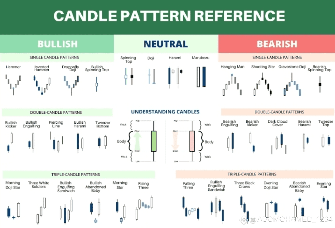 > ملاحظة مهمة: تفسير أي نمط يعتمد على السياق (الاتجاه السابق، مستوى دعم/مقاومة، الإطار الزمني، والحجم). لا توجد شمعة مؤكدة بحد ذاتها — فقط احتمالات.