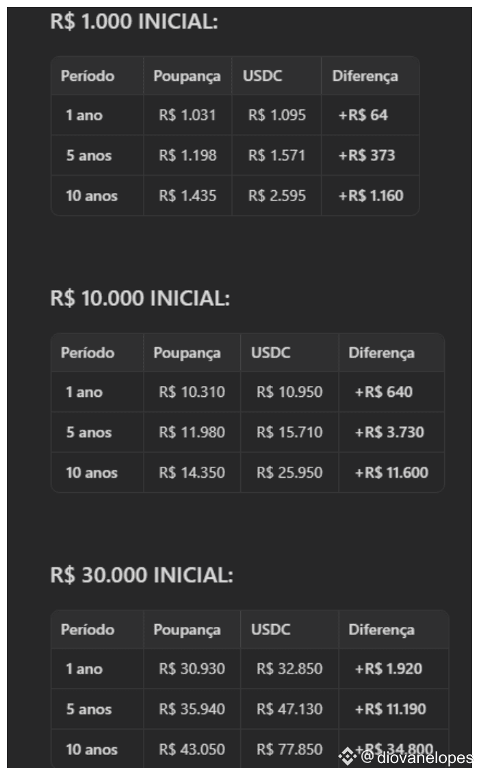 Você sabia que mesmo com rendimentos similares, investir em USDC pode resultar em 81% mais dinheiro que a poupança em 10 anos? Vou mostrar os números que vão te chocar.