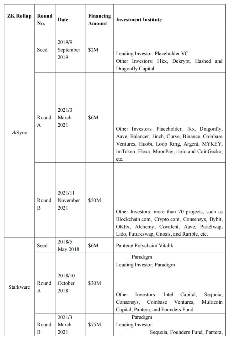 Como o ZK tem atraído muita atenção devido às suas vantagens técnicas, como pode ser visto no gráfico acima, dois projetos importantes do ZK Rollup também foram favorecidos por muitas instituições de investimento. Em particular, o zkSync obtém investimentos maciços de bolsas e partes de projetos da web 3.0. Não é difícil ver que muitas bolsas centralizadas conhecidas e projetos da web 3.0 estão bastante otimistas em relação ao ZK Rollup.