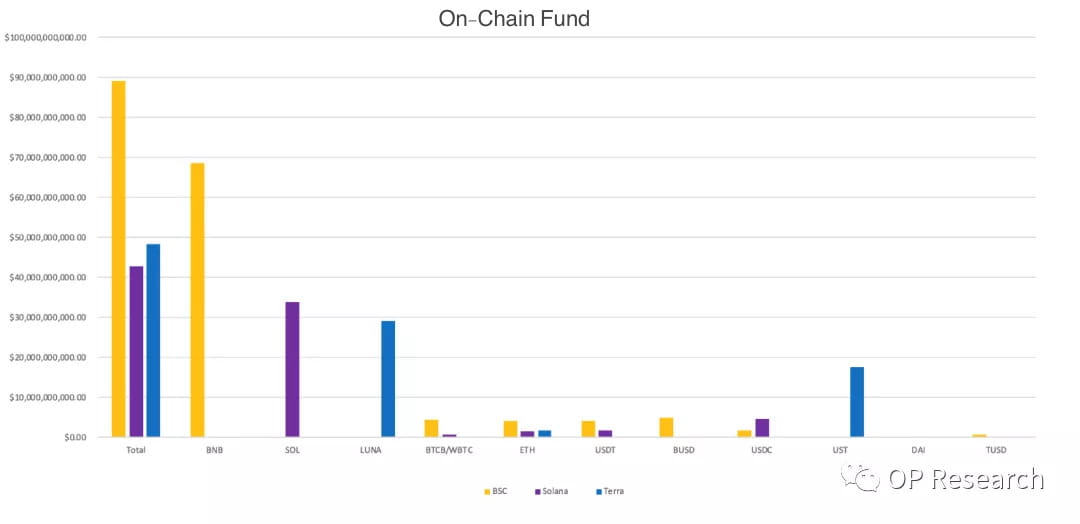 O ativo on-chain é a coleção de tokens convencionais emitidos na blockchain que possuem poder de compra relativamente estável, como BTC, ETH, BNB,USDT, USDC e DAI. O número de ativos de alta qualidade em uma blockchain pública determina o espaço expansível para seu ativo na cadeia. Atualmente, não existe um método universal de hipoteca de crédito no blockchain, e a alavancagem só pode ser aumentada pelo penhor de ativos, enquanto os ativos penhorados são geralmente ativos de alta qualidade para garantir a segurança. Portanto, escolhemos três blockchains públicos com mais ativos de alta qualidade atualmente como representantes: BSC, Solana e Terra. Conforme mostrado na tabela abaixo, os principais ativos da cadeia nas três blockchains públicas são de US$ 10 bilhões e são principalmente os tokens de blockchain públicos, BTC e ETH, bem como stablecoins como USDT, USDC e UST na blockchain pública. Os abundantes ativos na rede promovem grandemente o desenvolvimento da ecologia na rede.