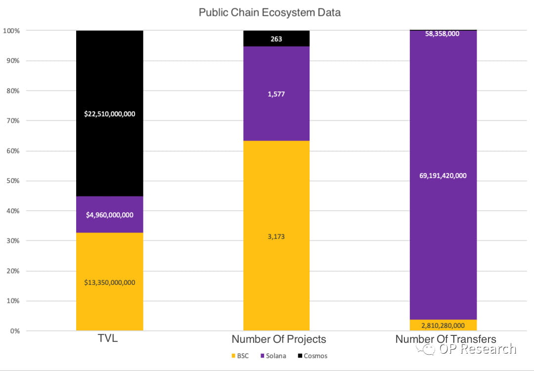 A quantidade e a qualidade dos projetos ecossistêmicos são outros fatores importantes que determinam o desenvolvimento da cadeia pública além do capital. Projetos de alta qualidade podem atrair um grande número de utilizadores ativos, gerar ativos consideráveis e gerar fundos enormes. Além disso, o estabelecimento de um ecossistema perfeito requer um certo número de projectos de alta qualidade, que possam criar boas experiências interactivas para utilizadores e desenvolvedores, possam resistir em maior medida aos riscos externos e expandir o âmbito de utilização dos fundos. Com base nisso, selecionamos BSC, Solana e Cosmos para julgar o desenvolvimento de seus ecossistemas através do TVL na cadeia, do número de projetos e do número de transferências. Pode-se observar na tabela a seguir que o BSC possui o maior número de projetos, Solana possui o maior número de transferências e o Cosmos possui o maior TVL. Isso reflete que as três cadeias públicas têm suas próprias vantagens em um ecossistema: 1 Como cadeia lateral Ethereum, o BSC é compatível com todos os projetos baseados em EVM; 2. Solana pode maximizar a eficiência de transferência e otimizar a experiência de interação por meio de alto TPS; 3. O Cosmos conecta todas as cadeias IBC por meio do protocolo IBC, incluindo o TVL de todas as cadeias IBC.