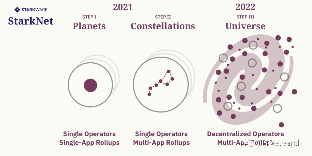 Para Starkware, StarkEx foi lançado em junho de 2020 como seu mecanismo de escalabilidade L2, aprovando a criação de ZK Rollup específico de aplicativo suportado por Cairo e STARKs. Atualmente, existem projetos como dydx, Immutable, Deversifi e Sorare baseados em StarkEx em operação. Agora, o valor bloqueado na cadeia atingiu US$ 1,16 bilhão, mais de 140 milhões de transações foram processadas e o valor acumulado das transações ultrapassou US$ 518 bilhões. De acordo com o seu caminho de desenvolvimento oficial, eles se concentrarão na execução do mesmo L2 global de múltiplas aplicações na mesma StarkNet, para alcançar a interoperabilidade entre diferentes aplicações e reduzir os custos das taxas de gás devido à melhoria das economias de escala e, finalmente, realizar o terceira fase da operação descentralizada.