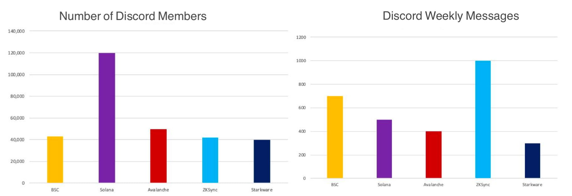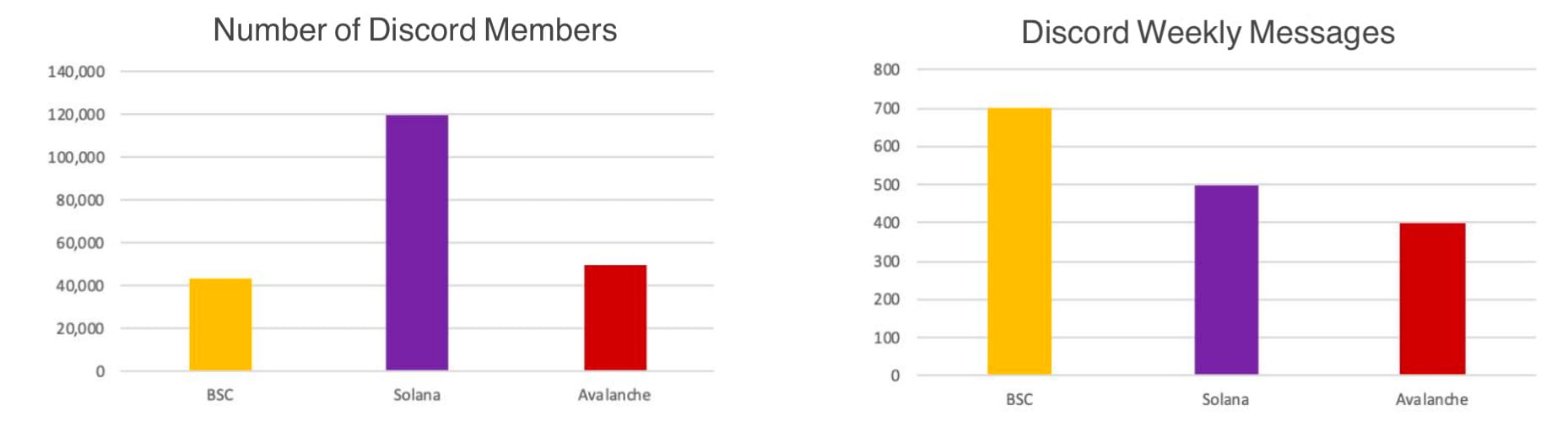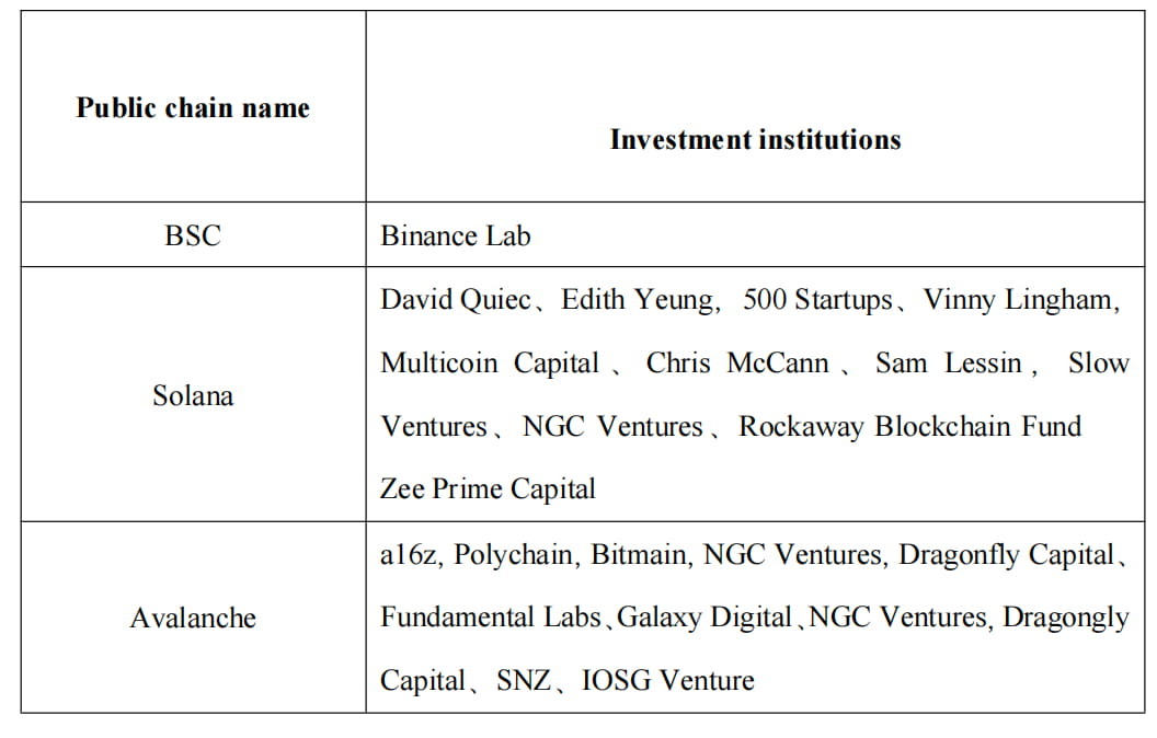 Comunidade refere-se à atividade da comunidade da cadeia pública e ao apoio de instituições de investimento. Uma cadeia pública precisa de atenção e fundos suficientes para se desenvolver de forma sustentável e de longo prazo. Observamos principalmente o número total de usuários, o número de postagens e o conteúdo das mensagens nas redes sociais. As instituições de investimento observam principalmente os primeiros investidores da cadeia pública e os recursos que investiram na cadeia pública, tais como capital, publicidade e cooperação. Após uma investigação abrangente, selecionamos BSC, Solana e Avalanche. Conforme mostrado na figura abaixo, as três comunidades da cadeia pública são grandes e altamente ativas. O foco está na interação e no ecossistema da cadeia pública, além do aumento do preço do token. Especificamente, devido às suas vantagens na fase inicial, o BSC possui um ecossistema rico e acumula um grande número de usuários ativos de alta qualidade, o que também se reflete em seu maior número de seguidores no Twitter e em discursos semanais discordantes. Solana e Avalanche adquiriram muitos usuários de telegramas e discord baseados em mercados emergentes. O conteúdo da mensagem inclui principalmente a popularização da ciência da informação on-chain, a questão da operação on-chain, a prevenção de fraudes e a consulta de projetos ecossistêmicos.