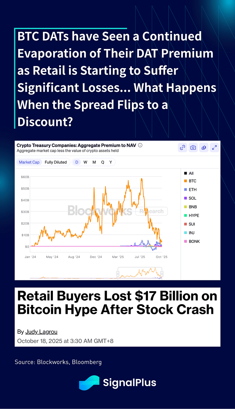 A cripto certamente teve semanas melhores, com os preços sofrendo mais um recuo na semana passada após o colapso repentino das altcoins da semana anterior. A Bloomberg relata que os investidores de varejo perderam $17 bilhões em DATs de BTC após o recente colapso, com os ETFs de BTC vendo os 2º piores saques semanais até agora (-1,2 bilhões), enquanto o prêmio do DAT continuou a despencar para mínimas recordes.