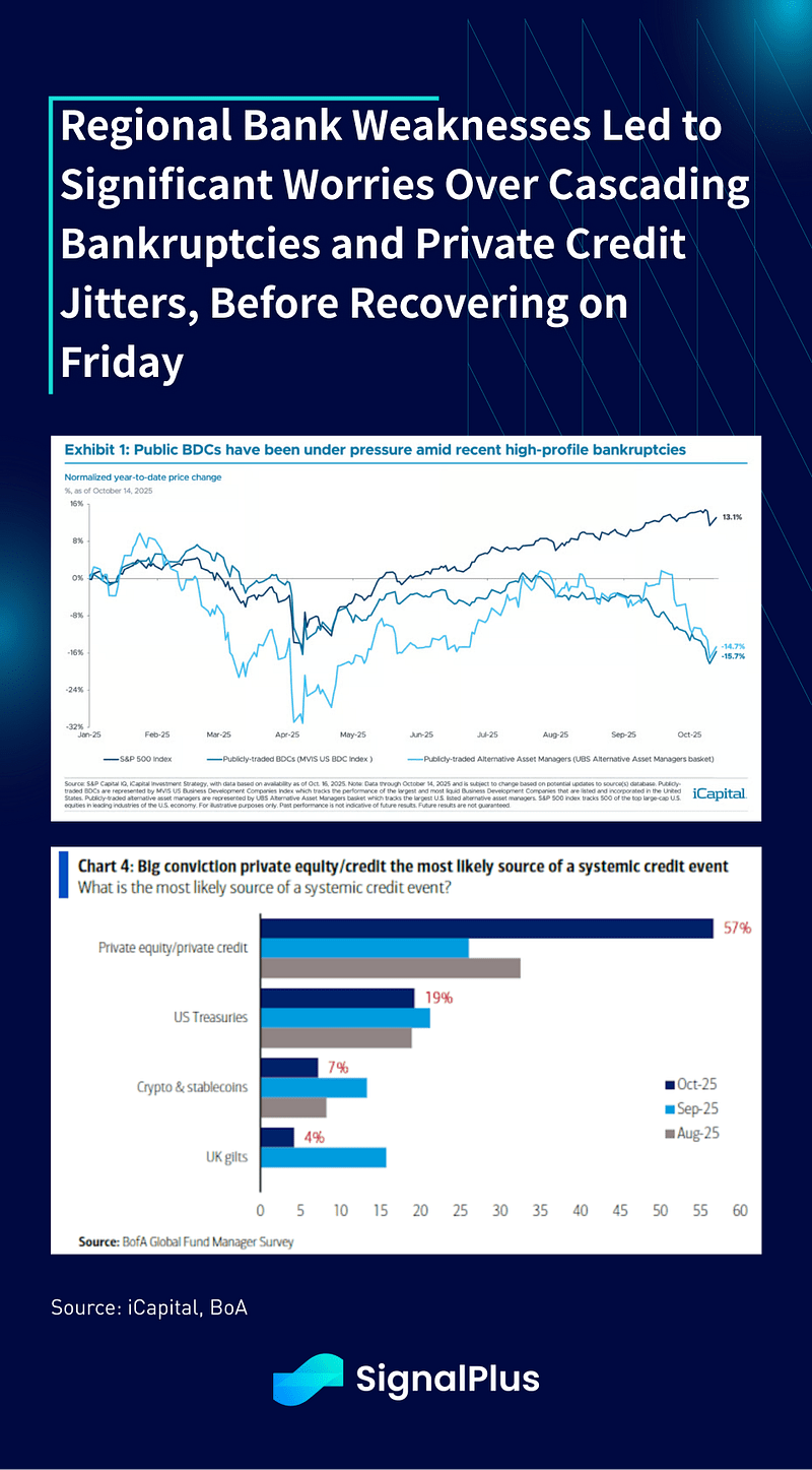 Além disso, mais um trimestre de resultados mais fortes do que o esperado para os lucros bancários ajudou a acalmar algumas das preocupações com o crédito privado da falência da First Brands e a baixa do credor automotivo subprime (Tricolor, $170M charge-off), mesmo apesar de Jamie Dimon afirmar ominosamente que “E eu provavelmente não deveria dizer isso, mas quando você vê uma barata, provavelmente há mais. E assim devemos — todos devem ser avisados sobre isso.”, em relação a mais inadimplências de crédito no futuro.