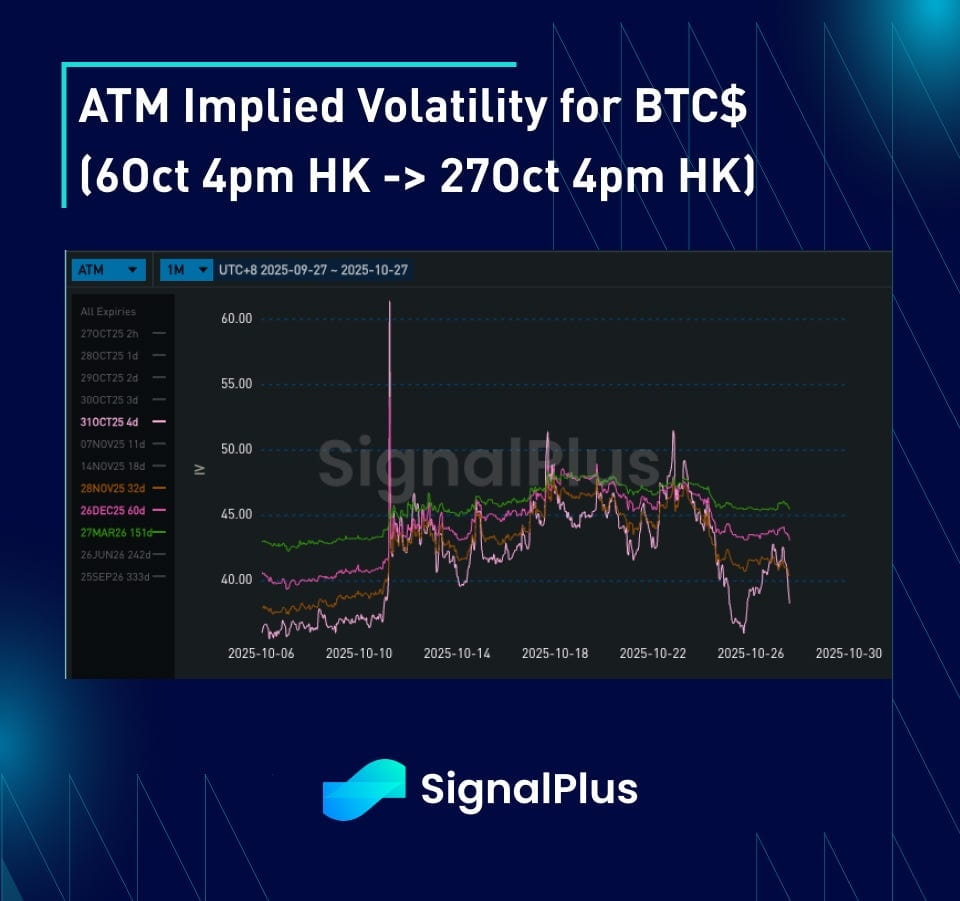 As volatilidades implícitas exibiram uma ampla gama nas últimas semanas, à medida que nos recuperamos agressivamente dos mínimos no evento de liquidação de 11Oct, com a realizada subindo dos 20 e poucos para 50 e, em seguida, mantendo-se na faixa dos 40 nos 10 dias seguintes, enquanto a liquidez do livro de ordens permaneceu fina. No entanto, com o spot respeitando finalmente a faixa mais ampla de $100–125k que tem limitado amplamente o ativo desde maio, a demanda por opcionalidade foi bastante moderada e, como tal, os níveis de volatilidade implícita não realmente 'excederam' em relação à realizada de uma maneira que já vimos anteriormente em tais episódios.