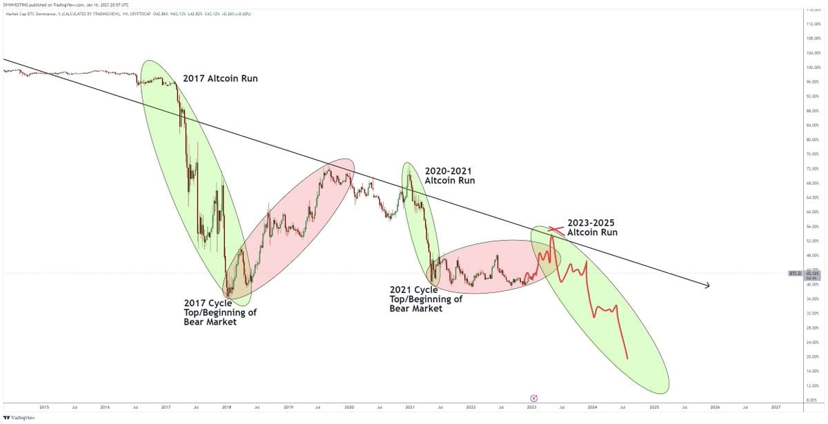 - O futuro das altcoins e seu potencial para outro grande ciclo podem ser avaliados examinando seus pares de Bitcoin. O último ciclo nunca viu o domínio do Bitcoin atingir um novo nível mais baixo, indicando que a altseason ocorre quando eles ultrapassam seus índices de Bitcoin.