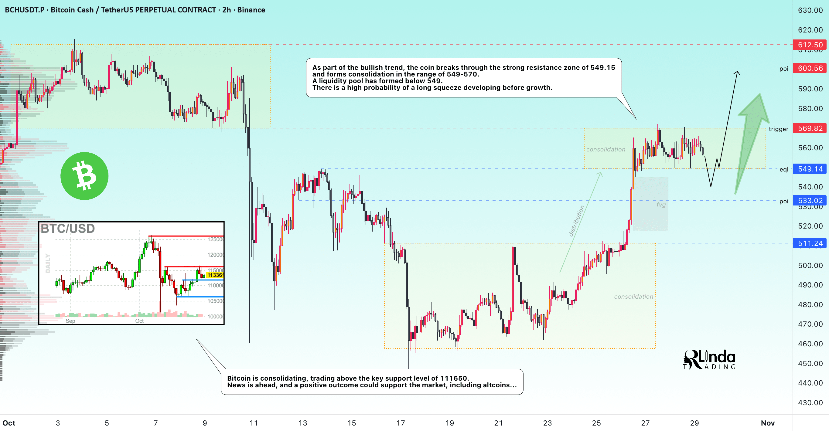 Em relação ao BCHUSDT, a moeda está rompendo uma forte zona de resistência em 549,15 como parte de uma tendência de alta e está formando uma consolidação na faixa de 549-570. Um aglomerado de liquidez foi formado abaixo de 549. Há uma grande possibilidade de pressão longa antes do crescimento.