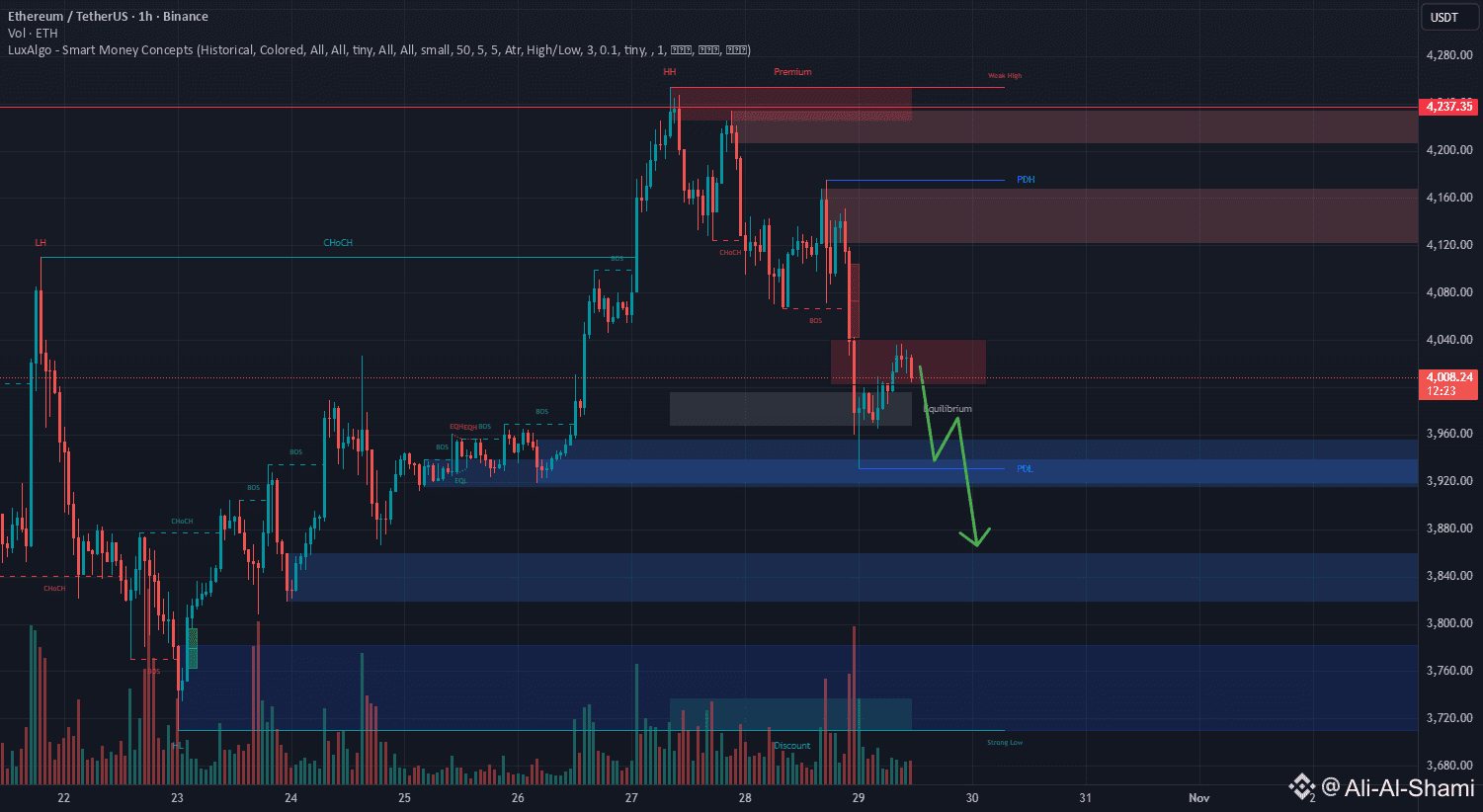 أكدت Ethereum للتو كسر الهيكل (BOS) بعد فشلها في الثبات فوق كلا المتوسطين المتحركين. هذه الرفض — مع هزة سيولة بالقرب من 4230 — تشير إلى احتمال استمرار الاتجاه نحو الأسفل.