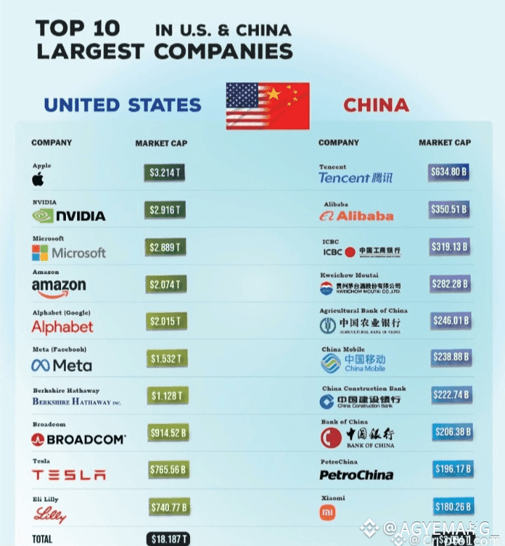 The three biggest companies in the U.S. are Apple, Nvidia, and Microsoft, while in China, the top players are Tencent, Alibaba, and ICBC.