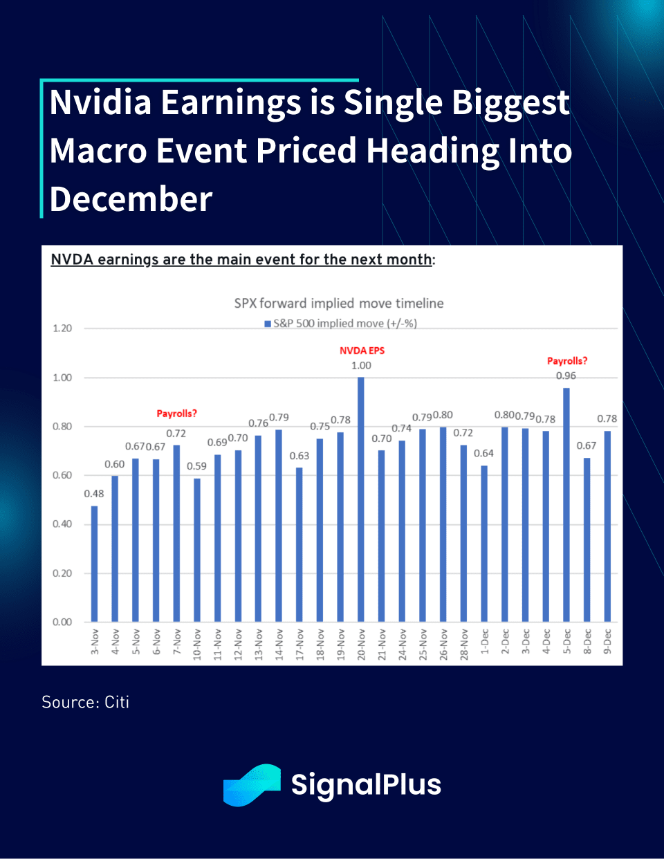 Naturalmente, os lucros da Nvidia (20 de novembro) estão sendo precificados como o maior evento de movimentação do mercado de ações no próximo mês, com um movimento de equilíbrio diário do SPX de +/- 1%, mesmo acima do NFP de dezembro.
