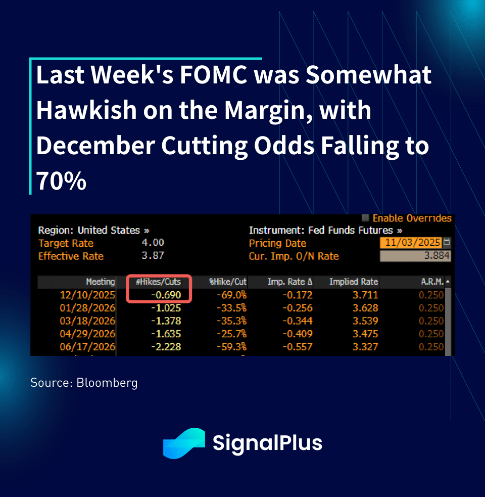 Dado os níveis de preços elevados, os ativos de risco ficaram decepcionados com a falta de alívio imediato, as ações dos EUA caíram 1–2% desde o ATH desde a reunião, as chances de corte de taxa em dezembro caíram para cerca de 70% após uma probabilidade quase certa de ~95% antes da reunião.