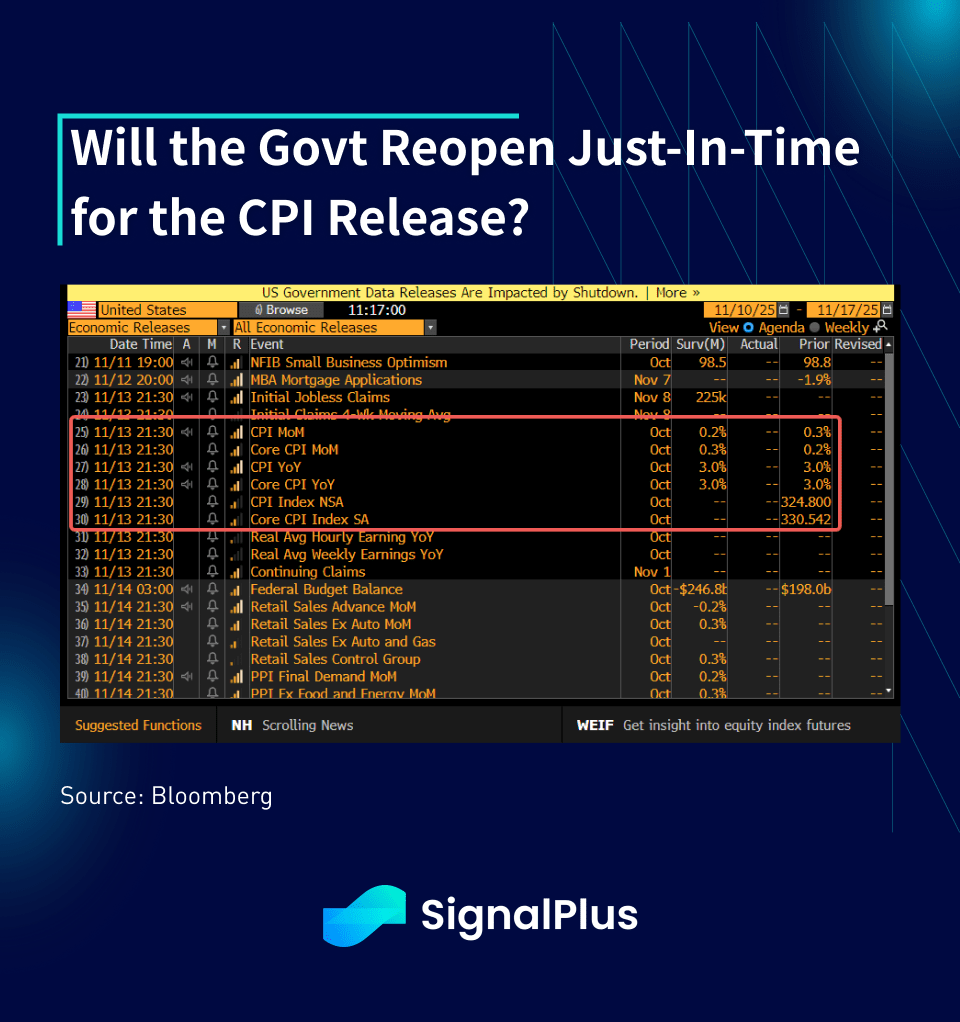 As primeiras manchetes desta manhã sugerem que os democratas do Senado votaram com os republicanos (contagem de 60–40) para superar o obstrucionismo e avançar com um pacote proposto que finalmente reabriria o governo federal. O projeto de lei ainda precisa passar pela votação da Câmara, o que pode levar até quarta ou quinta-feira, o que significa que pode não fazer o lançamento crítico do CPI a tempo.