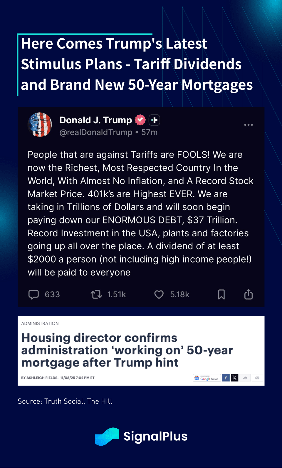 Os ‘dividendos tarifários’ são reminiscentes dos cheques de estímulo da covid que foram um estímulo de impressão de dinheiro direto e eficaz, enquanto as hipotecas de ultra-longa duração fornecerão alavancagem adicional ao sistema. Ambos devem ser vistos como novas formas de alívio de liquidez.