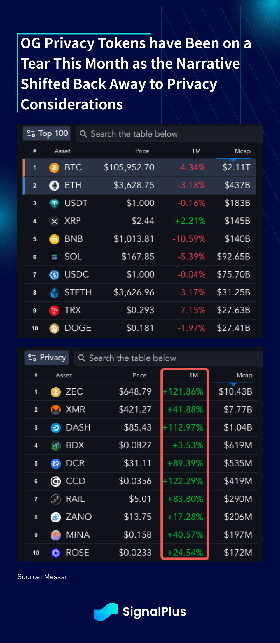 Enquanto isso, enquanto os principais e os melhores altcoins estão sendo punidos, as antigas moedas de privacidade (como Zcash) estão subindo, com o setor ganhando ~100% no último mês. Há um pouco de uma narrativa ressurgente sobre a necessidade de privacidade, dada a crescente e pesada infiltração do controle TradFi, embora ainda não esteja claro para nós se esse é um tema sustentável, especialmente considerando o ambiente legislativo.