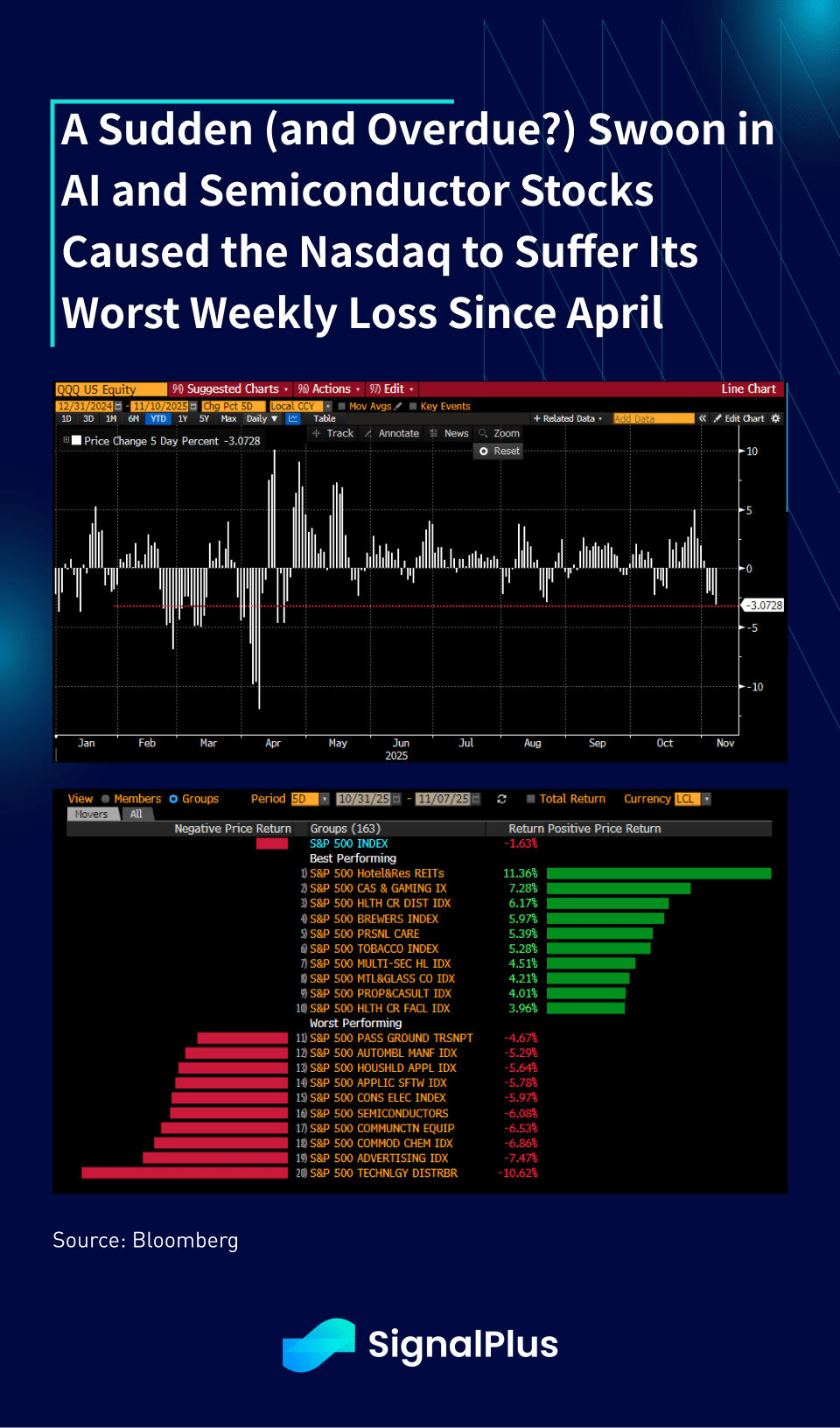 Os ativos macro tiveram uma semana difícil na semana passada, com o Nasdaq sofrendo sua pior perda semanal desde o Dia da Libertação em abril, puxado para baixo por preocupações sobre uma bolha de IA em desinflacão e dados econômicos decepcionantes.