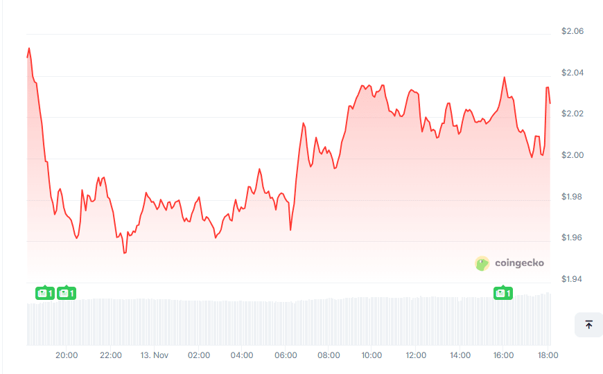 A estabilidade de preço entre $1,95–$2,05 mostra um sentimento cauteloso, mas uma liquidez constante e um volume de negociação ativo.